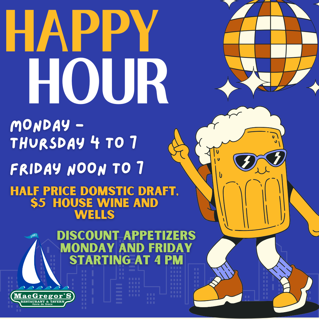 Friday Happy Hour 12-7 with discounted appetizers from 4-7pm in the bar.