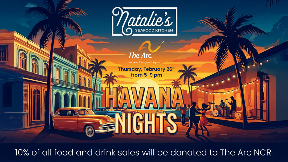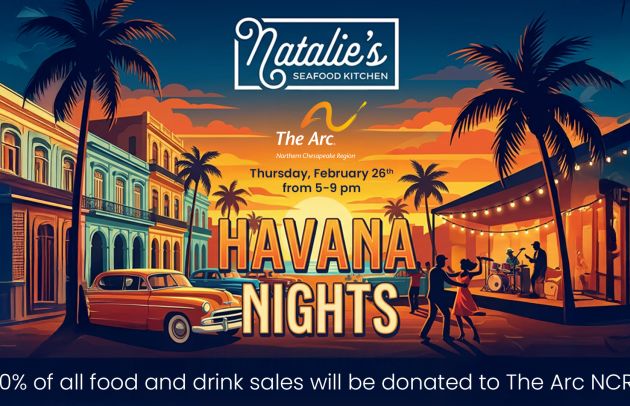 Come join us at Natalies Seafood Kitchen for our pre-event to kick-off our 21st annual After d' Arc Gala-Havana Nights! The pre-event is a "dine in fundraiser" that will take place on Thursday, February 26, 2026, from 5-9 pm! Natalie's Seafood Kitchen will be donating 10% of all food and drink sales back to The Arc NCR! Come join us for a great night of excellent food and drinks, raffles, live music and so much more!
