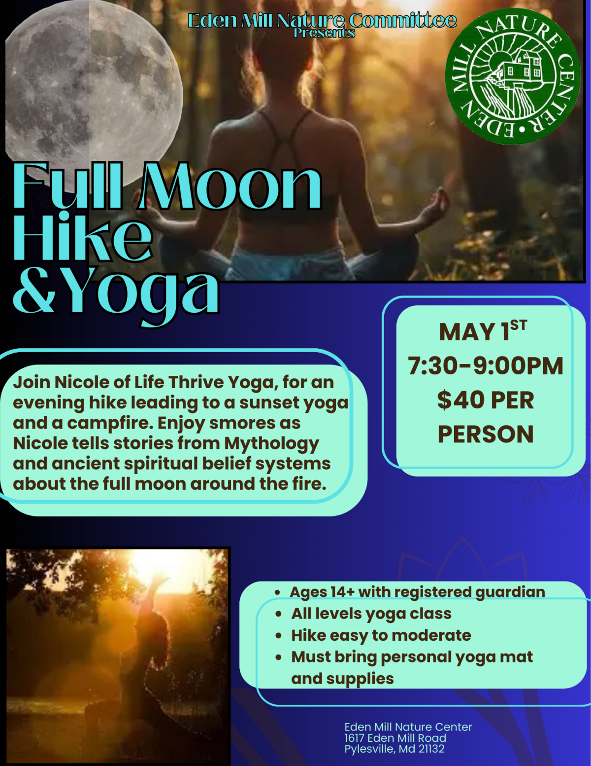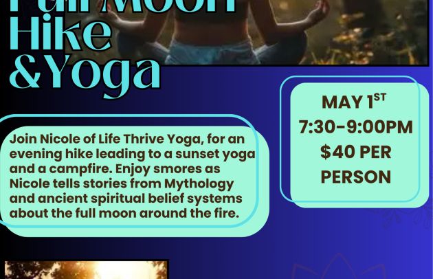 Join Nicole of Life Thrive Yoga, for an evening hike leading to a sunset yoga and a campfire. Enjoy smore as Nicole tells stories from Mythology and ancient spiritual belief systems about the Full Moon around the fire.