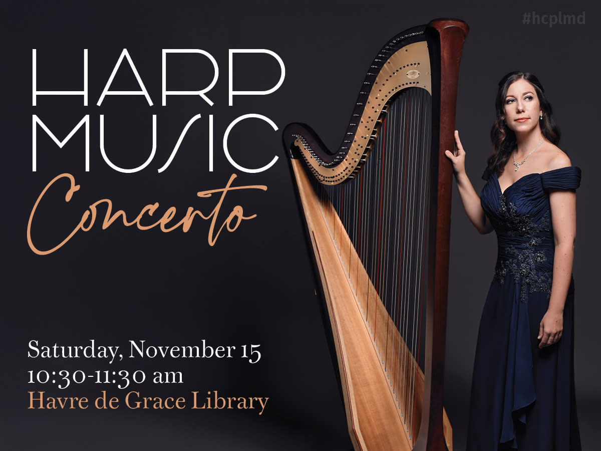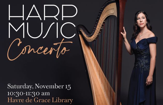 Harford County Public Library presents Harp Music Concerto November 15 from 10:30 to 11:30 a.m. at the Havre de Grace Library, 120 North Union Avenue. Baltimore harpist Jacqueline Pollauf will perform a variety of works for solo harp, showcasing the versatility of the instrument. Throughout this hourlong program, she'll include works by classical composers alongside favorites such as “Can't Help Falling in Love” and “Over the Rainbow.” Pollauf will also offer some remarks about her selections and how the harp works. The program is supported by the Havre de Grace Friends of HCPL. For more information, visit https://programs.hcplonline.org/event/14042634.