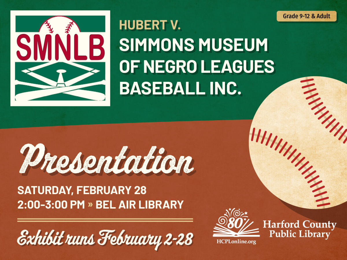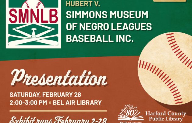 Harford County Public Library presents History of the Negro Baseball Leagues on February 28 from 2 to 3 p.m. at the Bel Air Library, 100 East Pennsylvania Avenue. Representatives from the Hubert V. Simmons Museum of Negro Leagues Baseball, Inc. will share the history of the Negro Leagues in Maryland. Their presentation will feature artifacts, pictures and video clips from the Simmons Museum. For more information, visit https://programs.hcplonline.org/event/14800699.