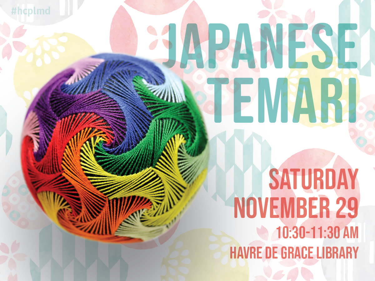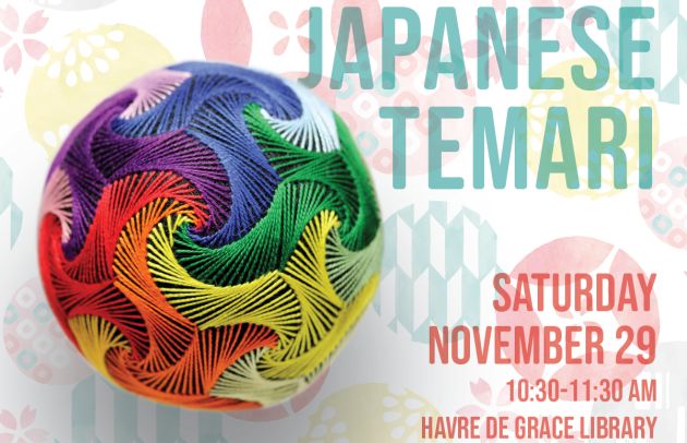 Harford County Public Library presents Japanese Temari November 29 from 10:30 to 11:30 a.m. at the Havre de Grace Library, 120 North Union Avenue. Learn about the ancient craft of Japanese temari (embroidered thread balls). Fiber Artist Jen Weber will share information about the history and development of this unusual art, right up to its present-day prevalence both in Japan and around the world. The secrets of what is actually inside these lovely creations will be revealed as well as what they are used for and how they are made. The program is supported by the Havre de Grace Friends of HCPL. For more information, visit https://programs.hcplonline.org/event/14055563.