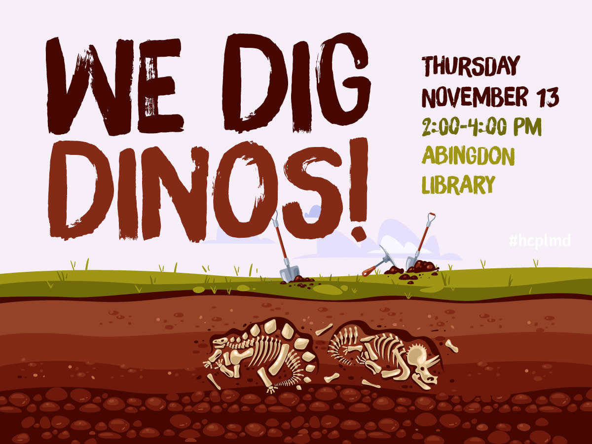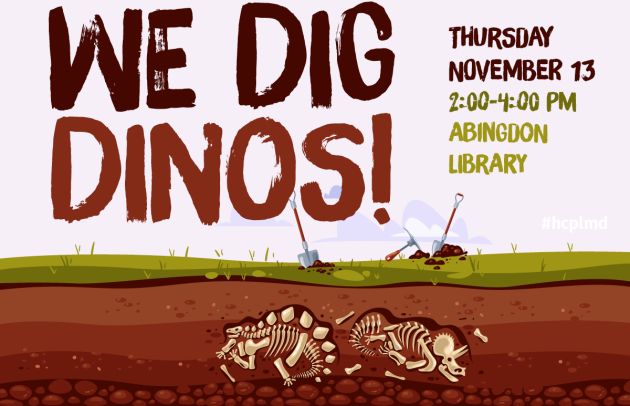 Harford County Public Library presents We Dig Dinos! on November 13 from 2 to 4 p.m. at the Abingdon Library, 2510 Tollgate Road. This family activity is perfect for curious explorers and future paleontologists, who will explore the prehistoric world of dinosaurs through interactive play, fossil digs and creative crafts. Each child attending must register prior to the event at https://programs.hcplonline.org/event/14037869. The program is supported by the Abingdon Friends of HCPL.