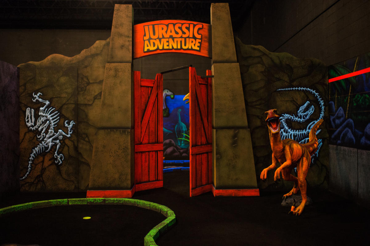 Jurassic Golf is Harford County’s first and only indoor Dinosaur themed Blacklight Mini Golf course and arcade. We feature a 4500 square foot dinosaur-themed mini golf course, complete with animated dinosaurs, fossils and CGI effects. We also feature (2) 400 square foot party rooms to rent for your child’s birthday party. We will provide a party planner for your event who will set up before, will conduct the activities and clean up after your event. You can bring your own food and cake for your event. Refrigerators are provided in the party rooms. We also have a large arcade that many games provide tickets to your game cards to trade in on-site for prizes.